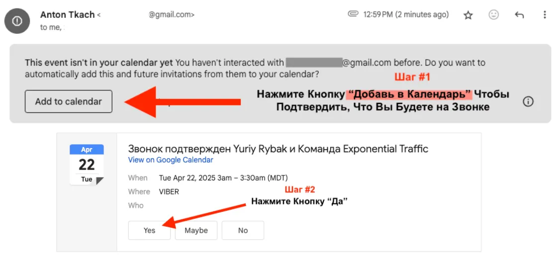 Обязательно ПОДТВЕРДИТЕ, что вы будете на звонке в выбранное время и день. Затем, добавьте его в ваш календарь как показано в инструкцииниже.